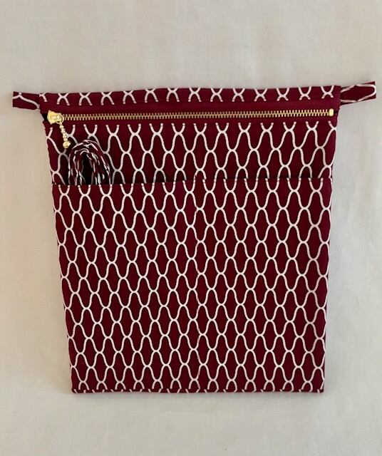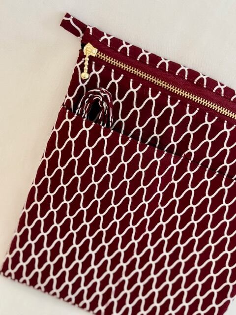 ファスナーの色はエンジ色×ゴールドで細部までこだわっております。
