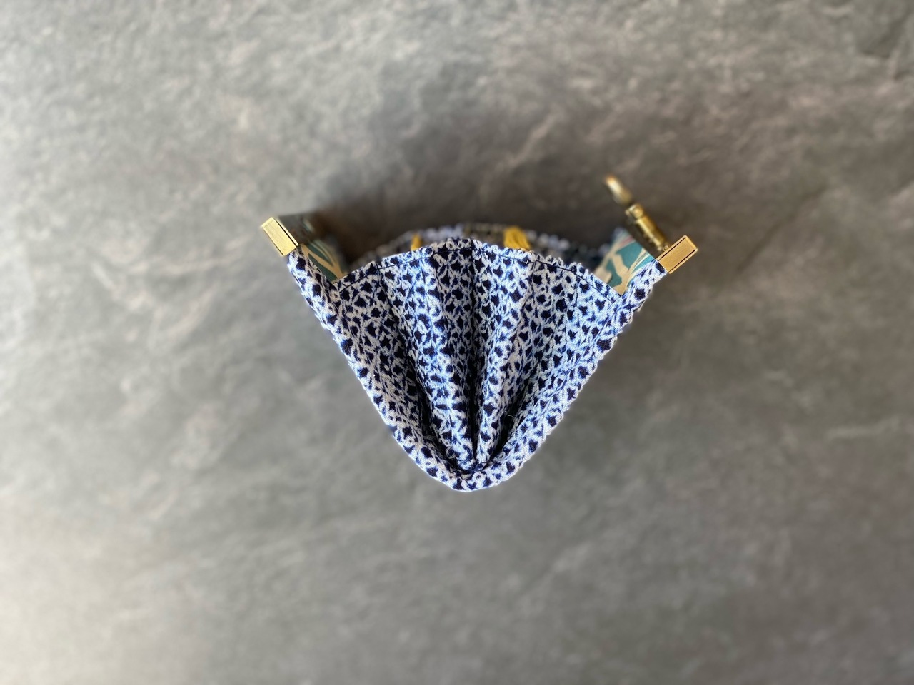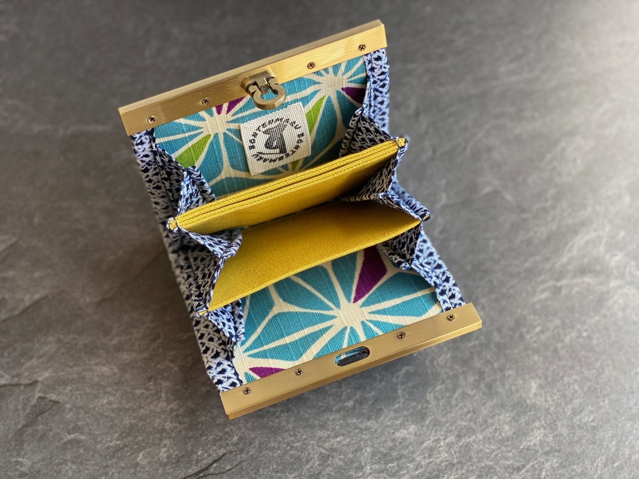 内側は、ブルー系の麻の葉柄の布に、ポケットや仕切り部分を差し色でカラシ色の帆布で仕立てております。