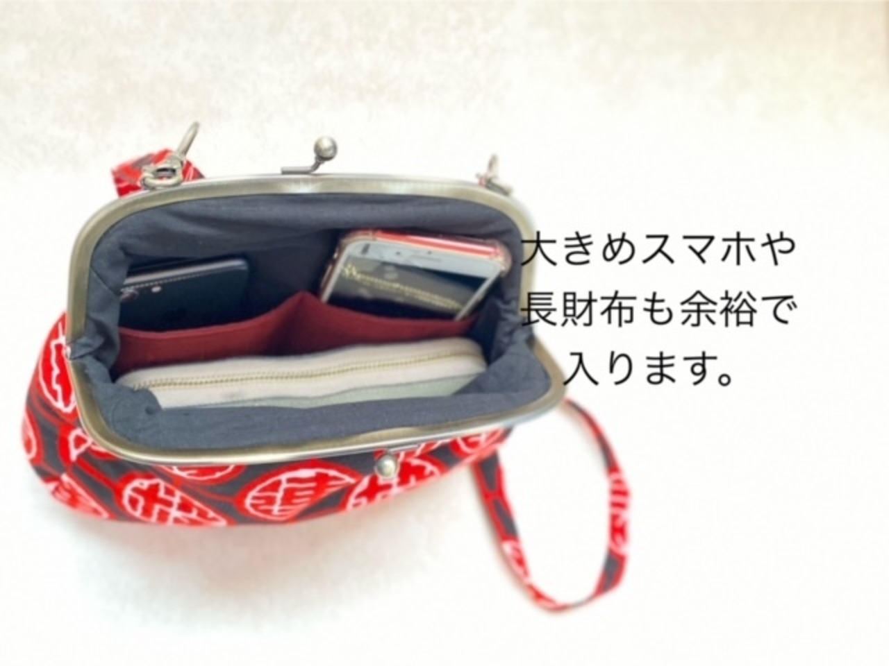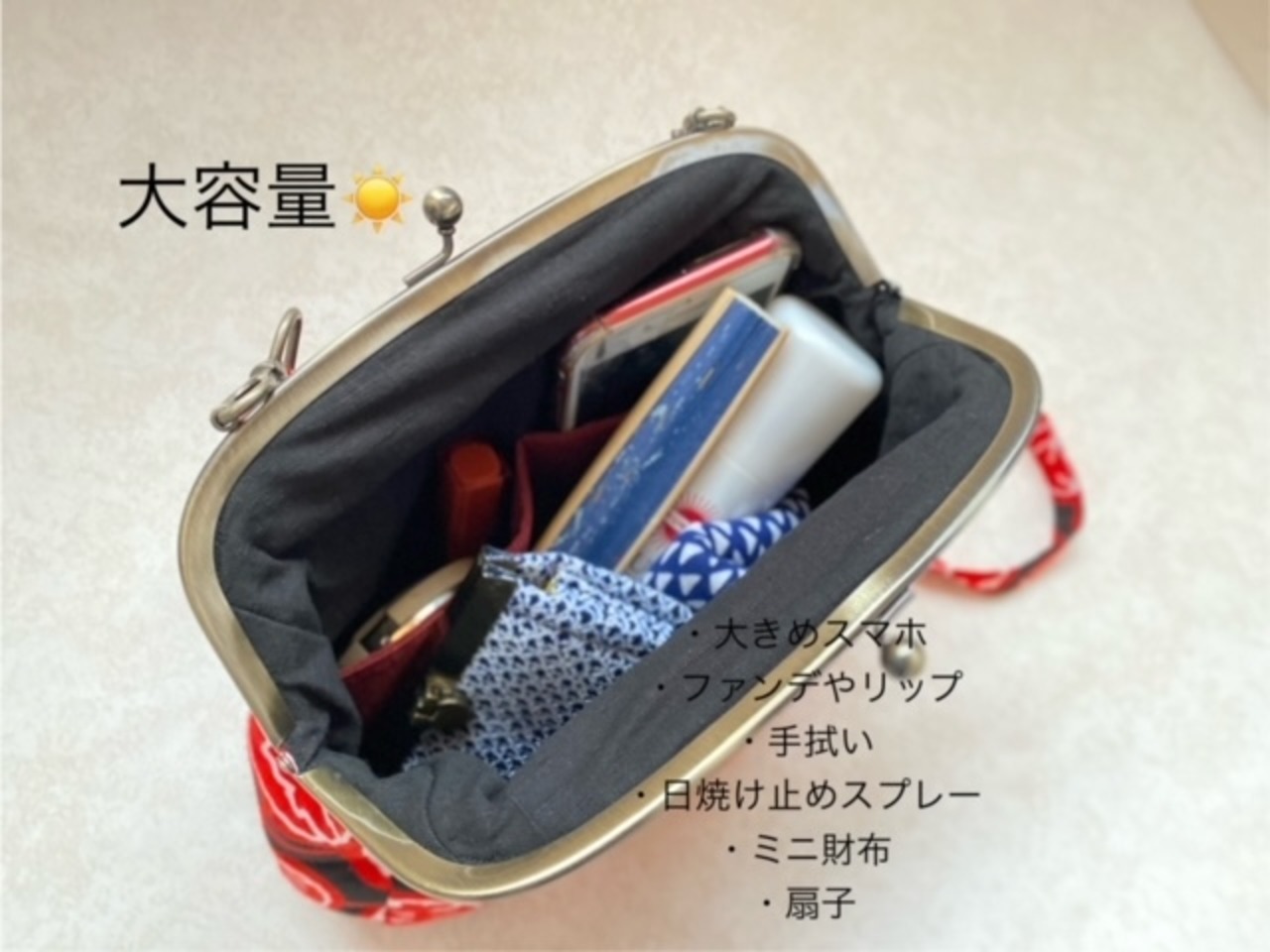 お祭りや普段使いに便利な大きめがま口バッグです。